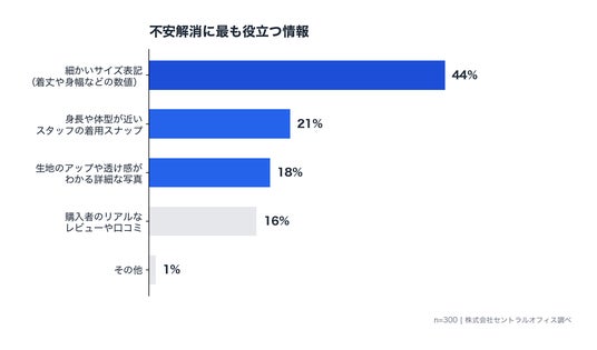 不安解消に最も参考になる情報を聞いたところ、全体の44%が「細かいサイズ表記(着丈や身幅などの数値)」を挙げました。次いで「身長や体型が近いスタッフの着用スナップ」が21%、「生地のアップや透け感などがわかる詳細な写真」が18%、「購入者のリアルなレビューや口コミ」が16%でした。
