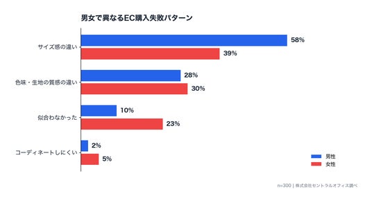 男性は58%が"サイズ違い"で失敗、女性の"着用イメージが湧かない"不安は男性の3.7倍と、数値型vsビジュアル型で分かれる傾向