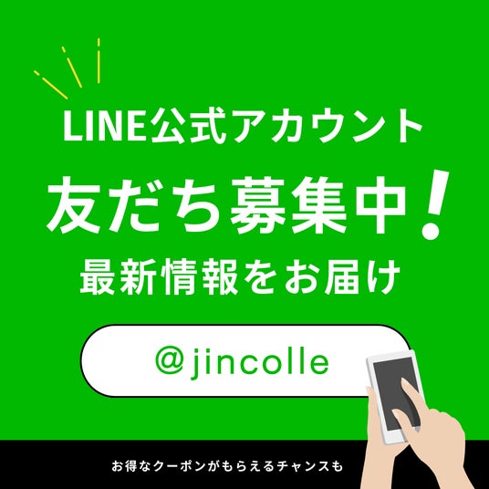 友だち追加で100円OFFクーポンプレゼント中です。お得なキャンペーンや、新着情報を発信しています。ID検索:@jincolle