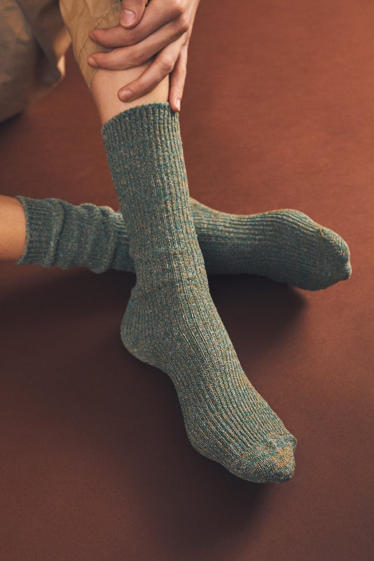 シャリシャリとしたクリスプ感と多色の糸を織り込んで深みのある色合いが特徴の「Crispy」。ルーズに履いてリラクシーかつ上質なムードを提案します。特殊なリブ仕様でワンサイズで22.0cm~27.0cmの足サイズに対応。