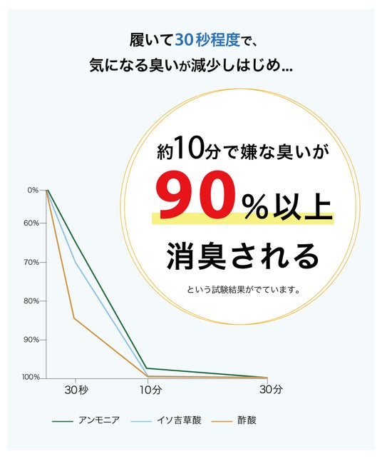履いて30秒程度で、気になる臭いが減少しはじめ、10分で90%以上が減少します。