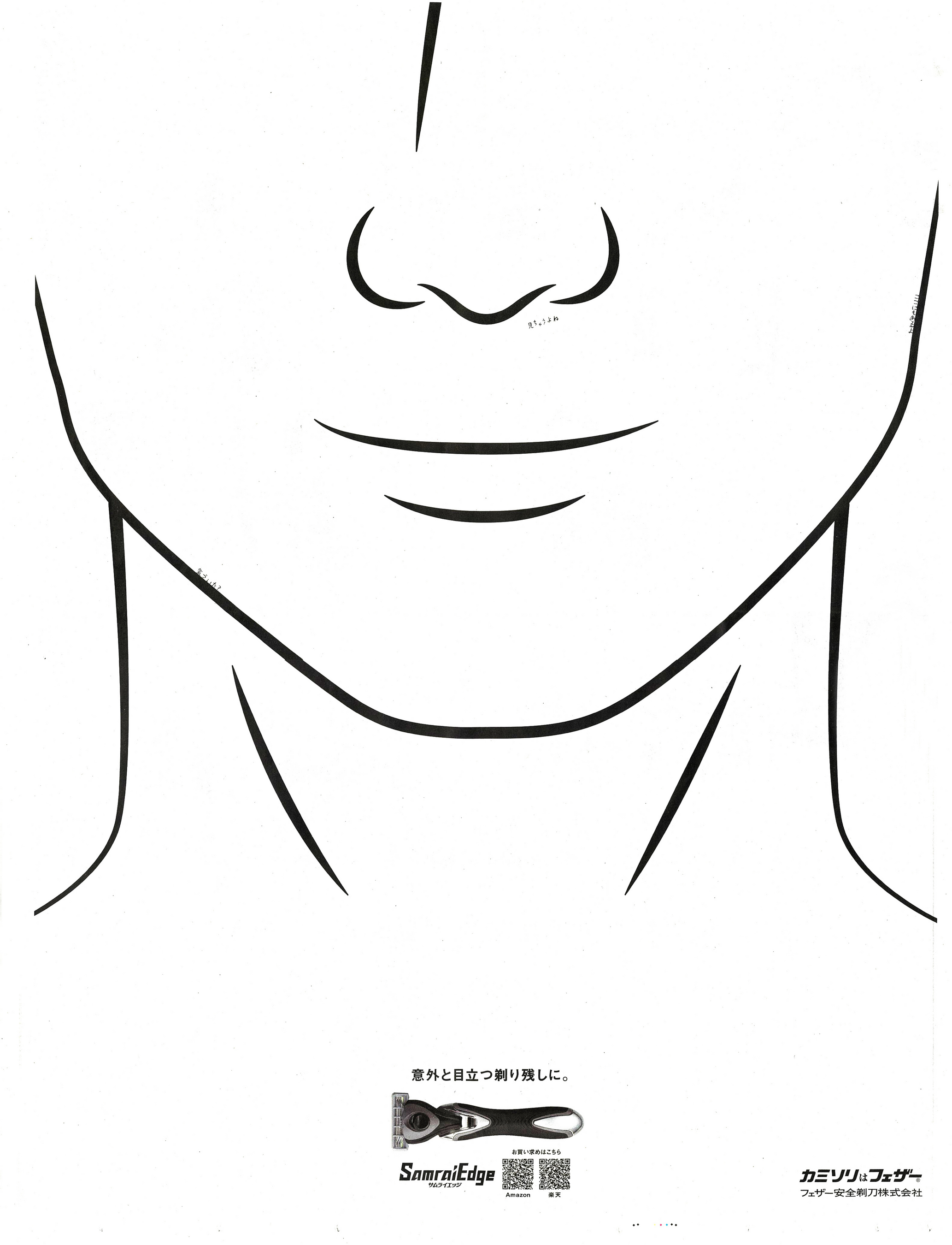 そり残しを防ぐ機能に定評があるT字かみそり「サムライエッジ」の販売促進のため、商品のターゲットとなる消費者層と親和性の高いスポーツ紙に広告を掲載。スポーツ紙という情報量の多い誌面の中で極端にシンプルなデザインを打ち出すことで、読者に目を止めてもらう仕掛けを施した。そり残しは意外に目立つということを示すため、顔のイラストの一部に印刷ミスにも見える「見ちゃうよね」のコピーを入れて、興味喚起。他2カ所にもコピーが隠れており、見つけた人にはより強い印象を残した。新聞ならではの大きなサイズを活用した、遊び心あふれるクリエーティブが高く評価された。