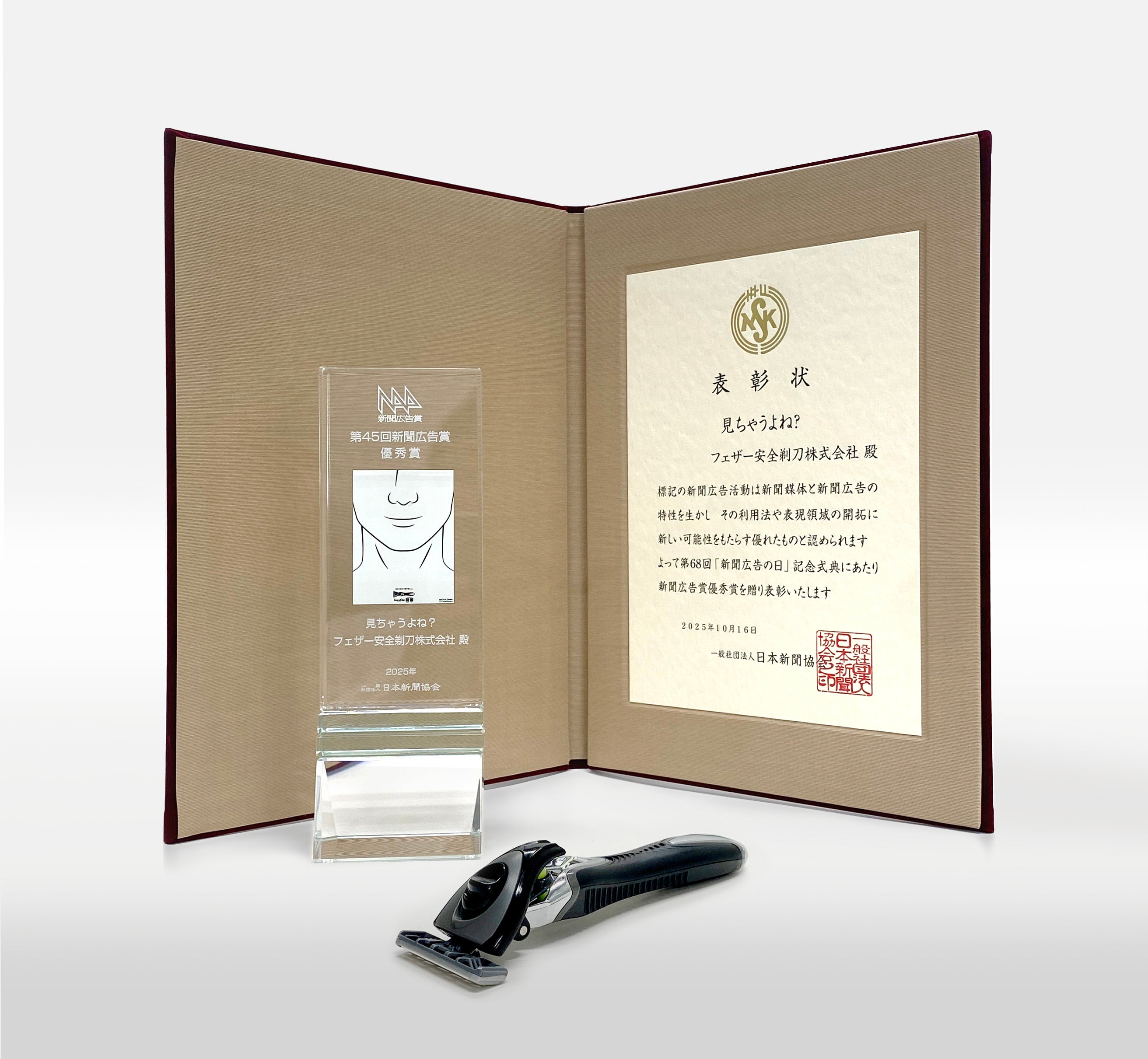 カミソリ製品をはじめ、理美容製品や医療用刃物の製造・販売を行うフェザー安全剃刀株式会社(本社:大阪市北区、代表取締役社長:岸田 英三)のT字カミソリ『サムライエッジ』の新聞広告が、新聞広告賞2025 広告主部門で優秀賞を受賞し、 10月16日(木)に東京・内幸町の帝国ホテルで開かれた第68回「新聞広告の日」記念式典での受賞式に参加しました。
