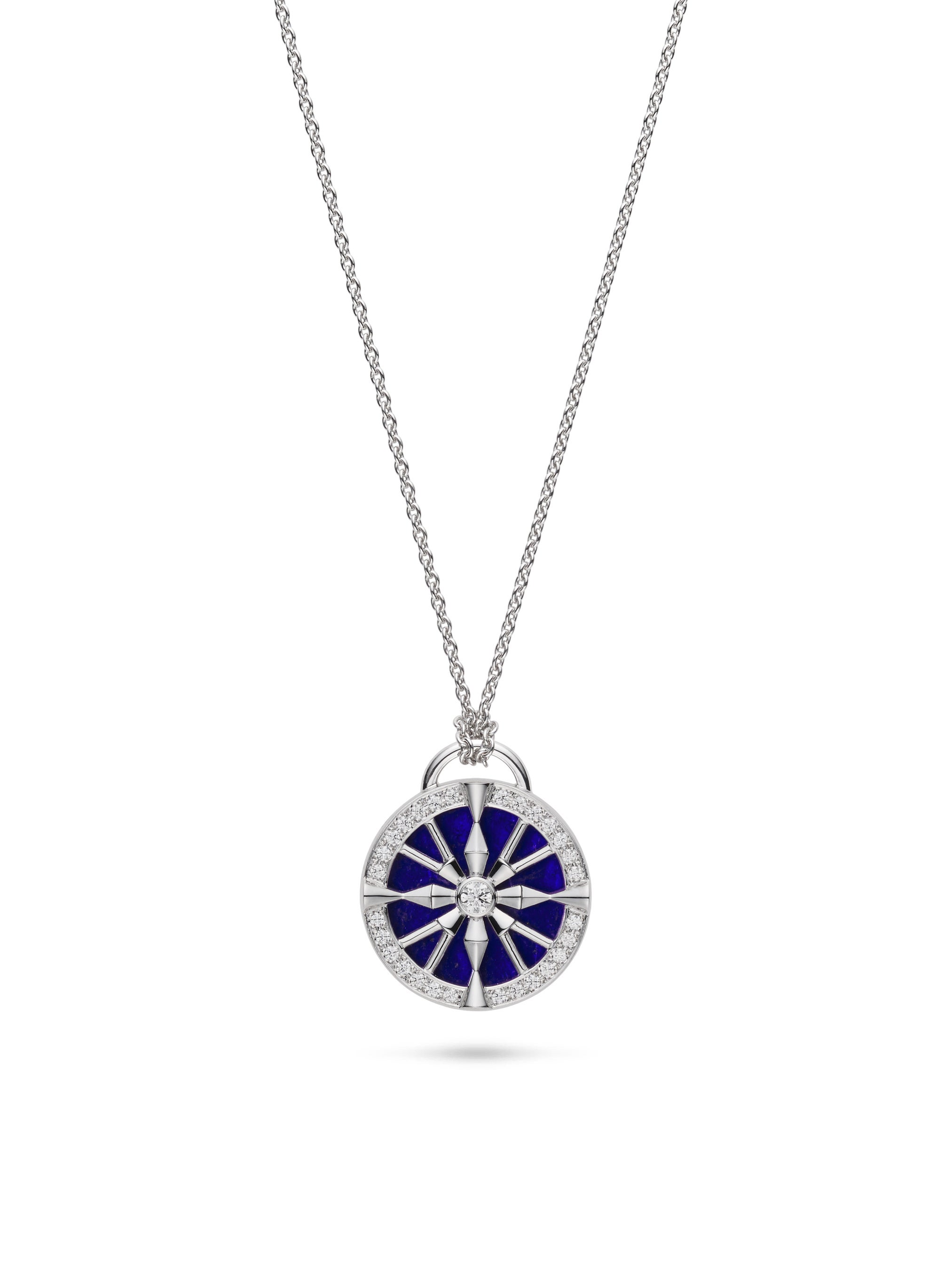 未来を照らすお守りのような存在として日常を華やかに彩るコレクションに、新たに加わったのはラピスラズリを主役にしたペンダント。深遠なブルーの色彩美と8本の矢に共鳴するダイアモンドの輝きは、身に着ける人に幸運を呼び寄せます。
