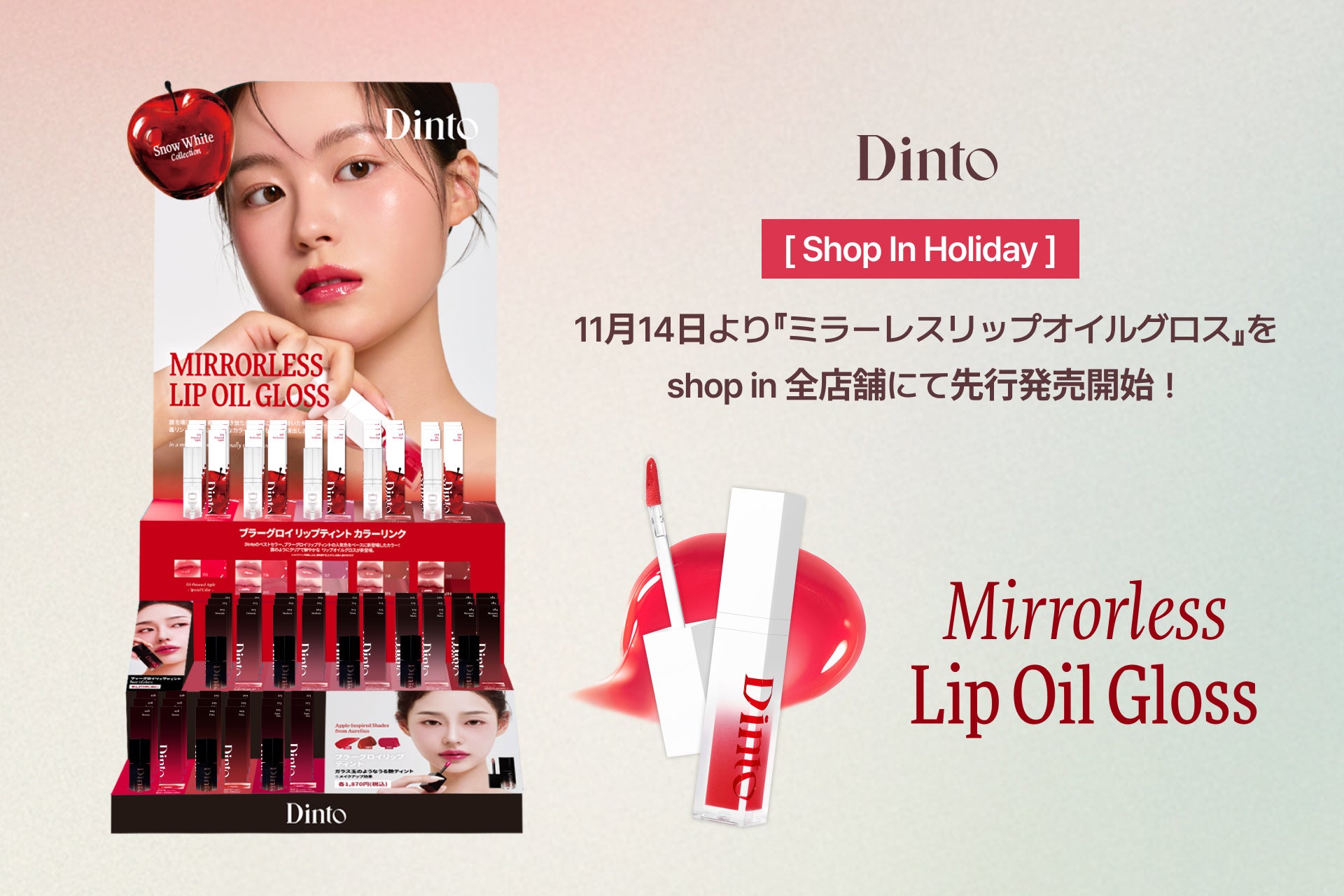 韓国コスメブランド「Dinto」の日本正規代理店である株式会社月架世交易(本社:東京都中央区、代表取締役:文 賢宇[ムン・ヒョヌ])は、2025年11月14日(金)より、全国のセレクトコスメショップ「shop in(ショップイン)」にて開催されるイベント『shop in Holiday』において、新商品『ミラーレスリップオイルグロス』を先行発売いたします。