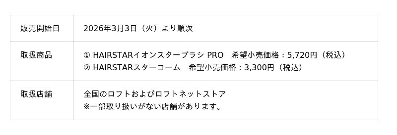 LIFELONG株式会社が展開するヘアブランド「HAIRSTAR」は、2026年3月3日(火)より、全国のロフトにて「イオンスターブラシ PRO」および「スターコーム」の販売を開始いたします。