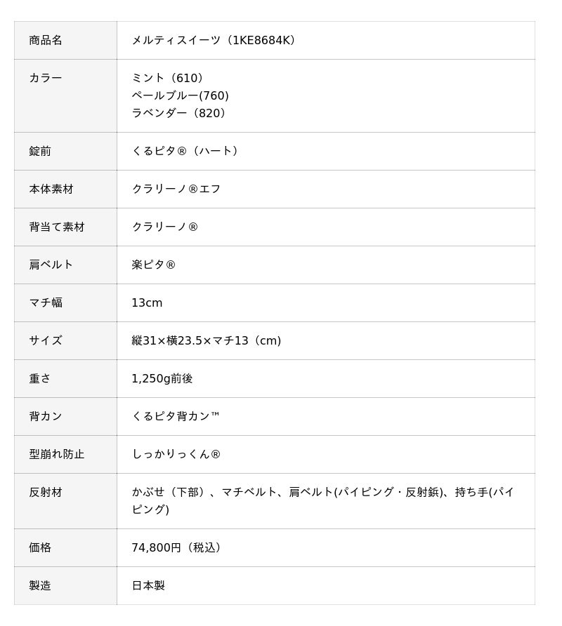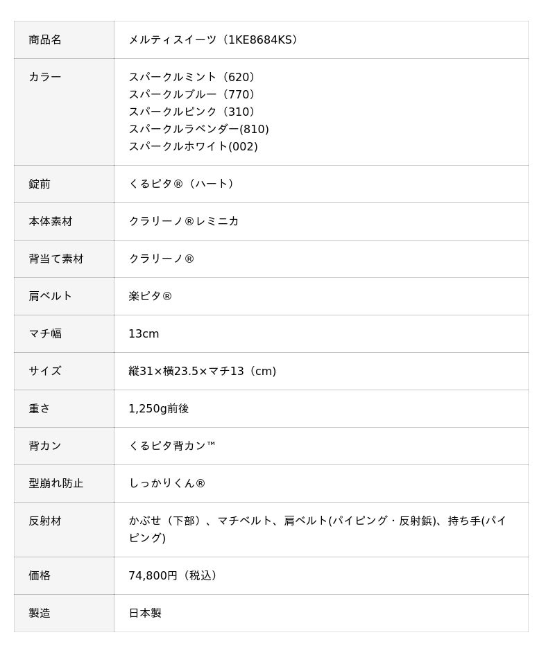 ランドセルは、6年間毎日をともにする大切な存在。だからこそ、心から「これが好き」と思える一品を選んでいただきたいと願っております。 「メルティスイーツ」は、甘くとろけるような愛らしさと、凛とした上質感を兼ね備えたランドセルです。お子さまの新しい門出に、やさしく、そして確かな彩りを添えてまいります。