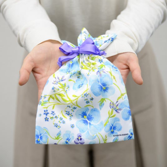 爽やかな青い花・パンジーが映える清潔感溢れた「巾着」は、メイク道具やサニタリーアイテムなど、小物入れとしても最適です。