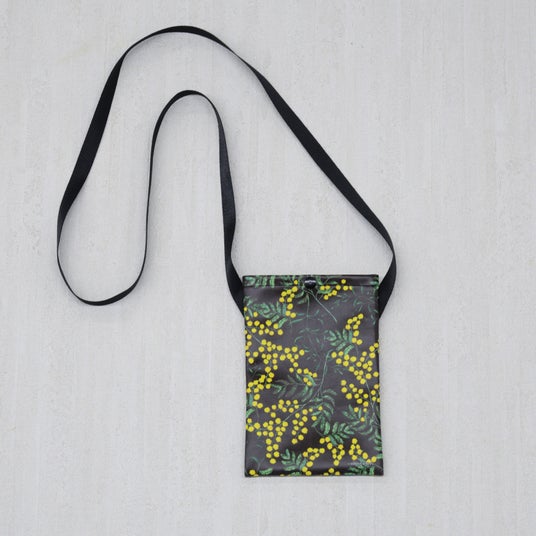 黒を基調とした「ショルダーポーチ」は、近年女性を中心に絶大な人気を誇る花・ミモザがたっぷりと描かれ、シックながらファッションのアクセントにもなる大人向けの一品となっています。