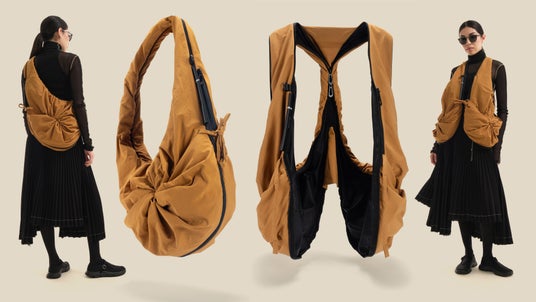折り紙からインスピレーションを得た独特なレイヤリング、生地使い、バッグとベストの2WAY仕様は斬新です。