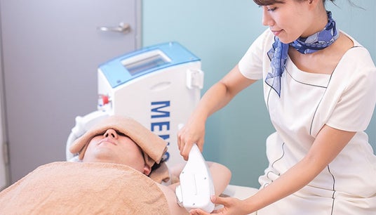 メンズクリアは、IPL(熱破壊式)×SHR(蓄熱式)のハイブリッド脱毛機を使用しています。照射面には光を効率的に通すクリスタル・サファイアを使用し、肌に接する部分をマイナス4度まで冷却しています。それにより脱毛照射時に発生する熱を緩和し、痛みを軽減しています。