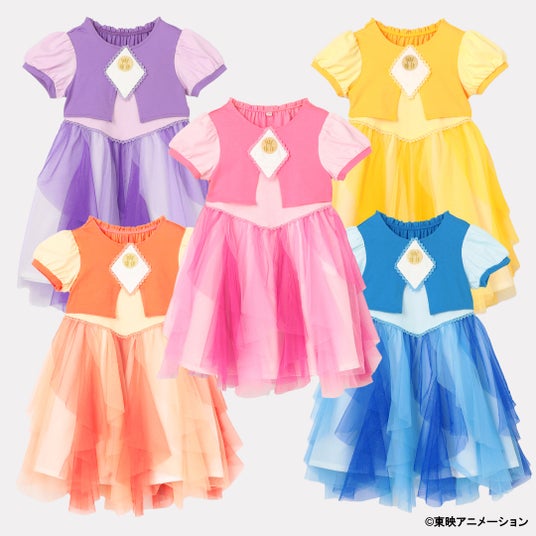 今回は、「も~っと!おジャ魔女どれみ」との初コラボとして、アニメに登場する『パティシエ日記』をイメージしたポシェットやおジャ魔女たちに欠かせないアイテムをプリントしたTシャツやスカート、魔女見習い服をイメージしたワンピースの計4型を提案します。作品中に登場する魔女見習い服をイメージしたワンピースは、どれみ、はづき、あいこ、おんぷ、ももこのそれぞれのキャラクターを連想させるカラー展開で姉妹やお友達とのおそろいコーデにもおすすめのアイテムです。