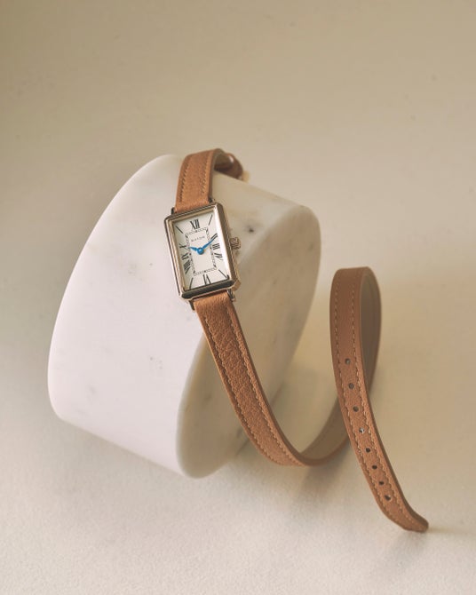 小ぶりなスクエアケース(29mm×19mm)は同じ佇まいのまま、素材の変化が“新しい表情”を生み出しました。細くしなやかなレザーが二重に重なることで、一本の線では生まれない“奥行き”と“動き”が腕元に生まれ、その重なりが月が描く静かな流れのような優雅さを添えます。柔らかなラインが腕元に自然な広がりを生み、アクセサリーのような軽やかさで日常を彩ります。光と影の調和が生む、月華の世界観。クラシカルなローマ数字、ミニマルなフェイス。それらが二重レザーの質感と重なり合い、“線の美しさ”と“余韻”をより際立たせます。レザーがつくる柔らかな影、ケースが放つ控えめな光。そのコントラストが、ツキコレクションが描いてきた静かな美の世界観をより豊かに広げていきます。