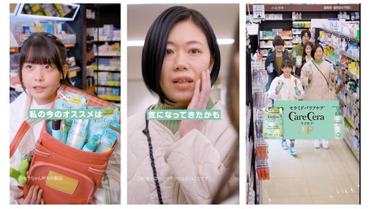 オリジナルショートドラマ「おしゃべりセラちゃん」では、ドラッグストア「クリエイト エス・ディー」を舞台に、世代を問わず使える「ケアセラAP 高保湿先行バリア乳液」の乾燥肌向けの特長をわかりやすく表現しています。