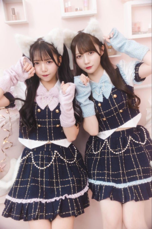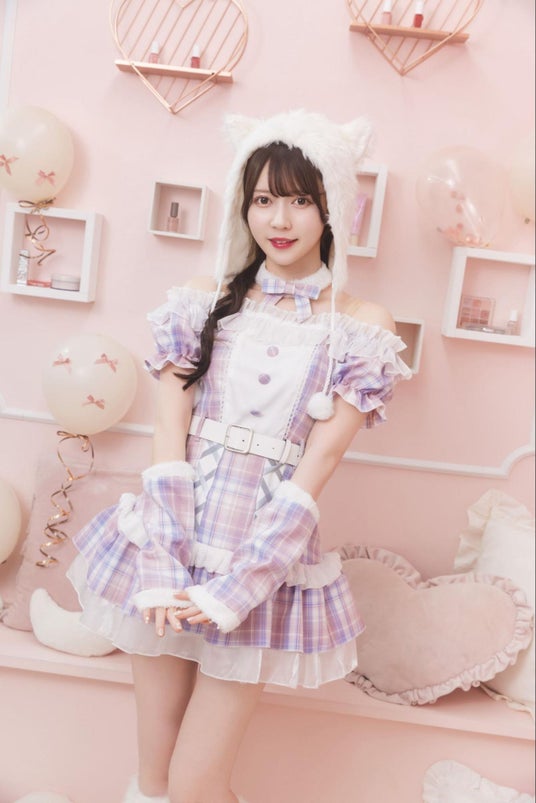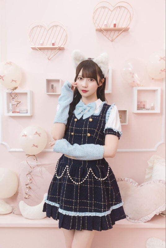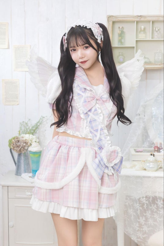 パステルカラーのセーラー服にフリルたっぷりのタスキをプラス。ファーのパフスリーブで、着やせ効果も抜群です。