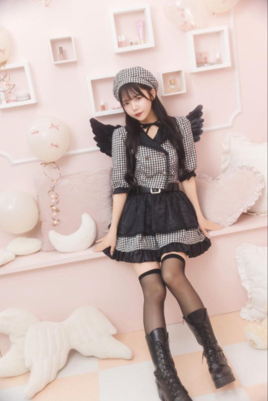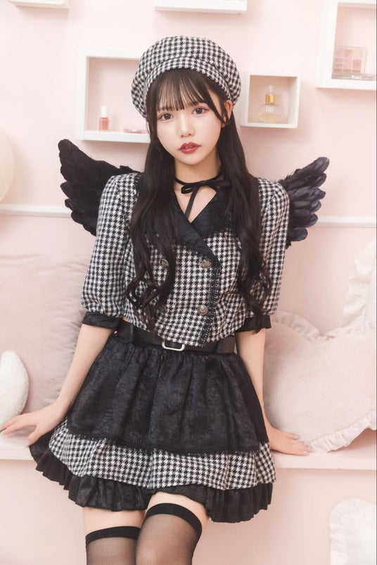 千鳥格子柄やジャケットスタイルを取り入れた、上品なデビルコスチューム。前から見ても後ろから見ても可愛い、存在感のある大きな羽根が魅力です。