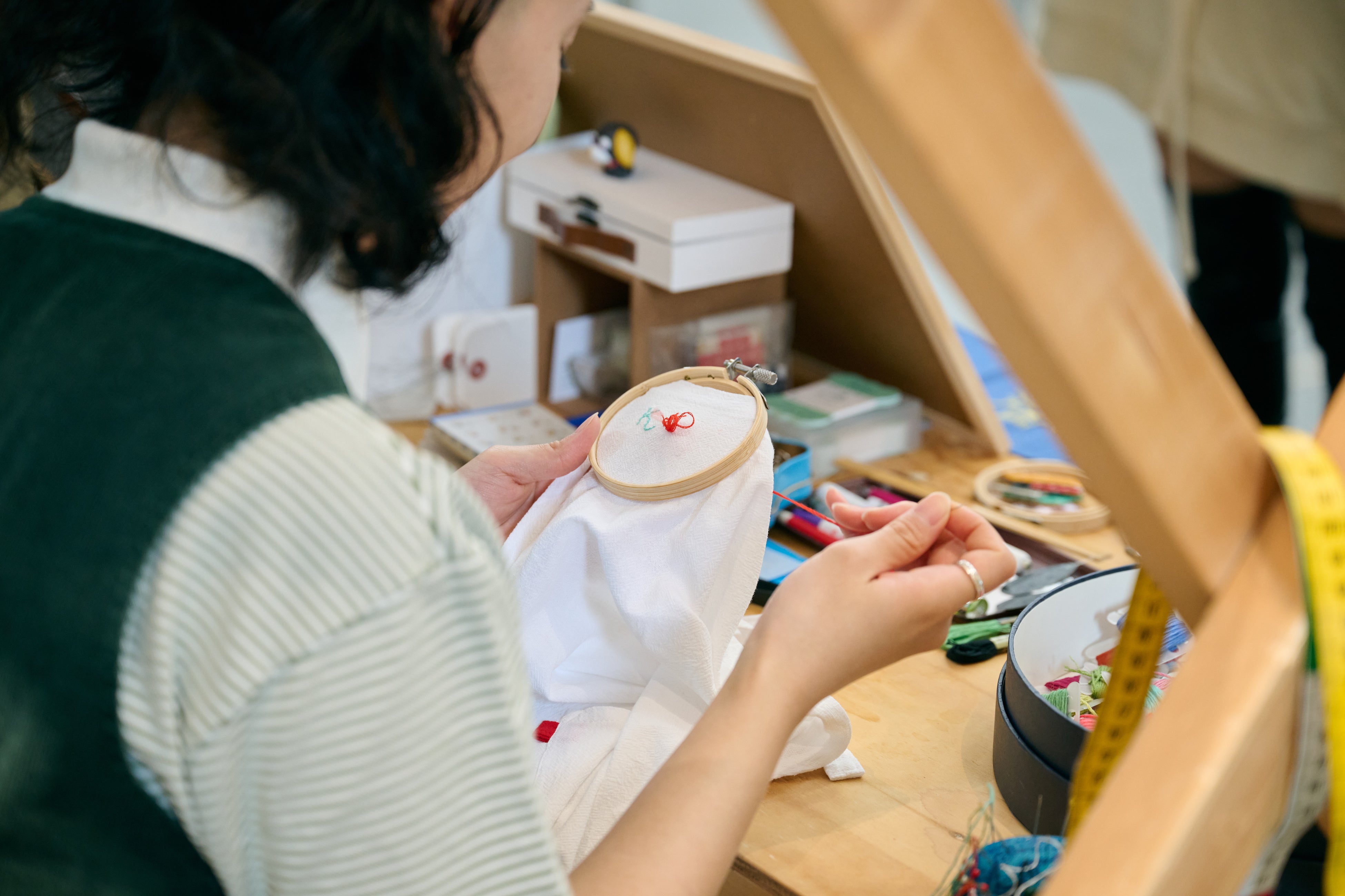 “ロングウェア”をコンセプトに、プロフェッショナルによるリペアパフォーマンスの披露とリペアサービス、カスタムサービスを提供するブースも設置。同コンセプトをテーマに活動するユニット「ごっこ/(GOKKO)」が登場し、来場者の似顔絵ドローイングやその場での刺しゅうカスタム、簡易リペアを実施。「洋服を楽しむ選択肢の一つとして“直す”文化を伝えたい」と語りました。