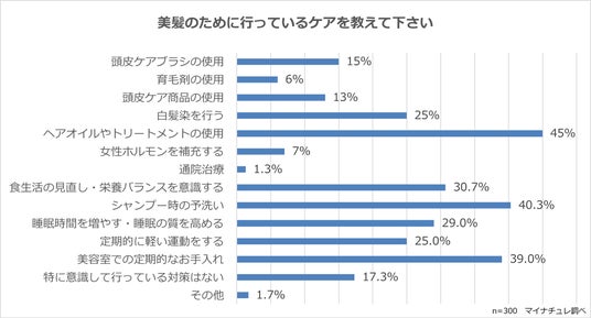 美髪対策として、「ヘアオイルやトリートメントの使用」と答えた方が45%と最も多く、ついで、「シャンプー時の予洗い」と答えた方が40.3%、「美容室での定期的なお手入れ」と答えた方が39%でした。