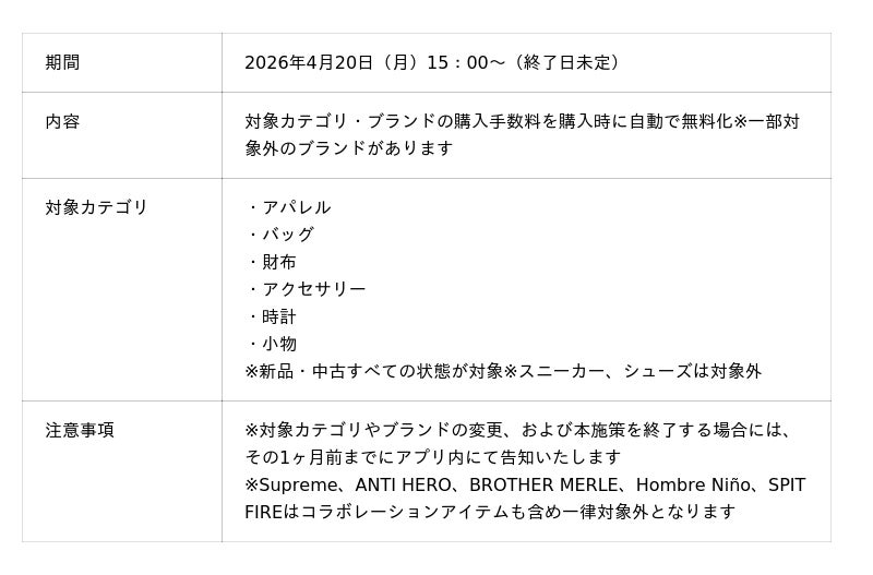 こうした背景をふまえ、より多くのお客様にファッションアイテムを気軽にご購入いただける環境を提供するため、このたびアパレルカテゴリーの購入手数料を長期的に無料にするキャンペーン実施が決定いたしました。