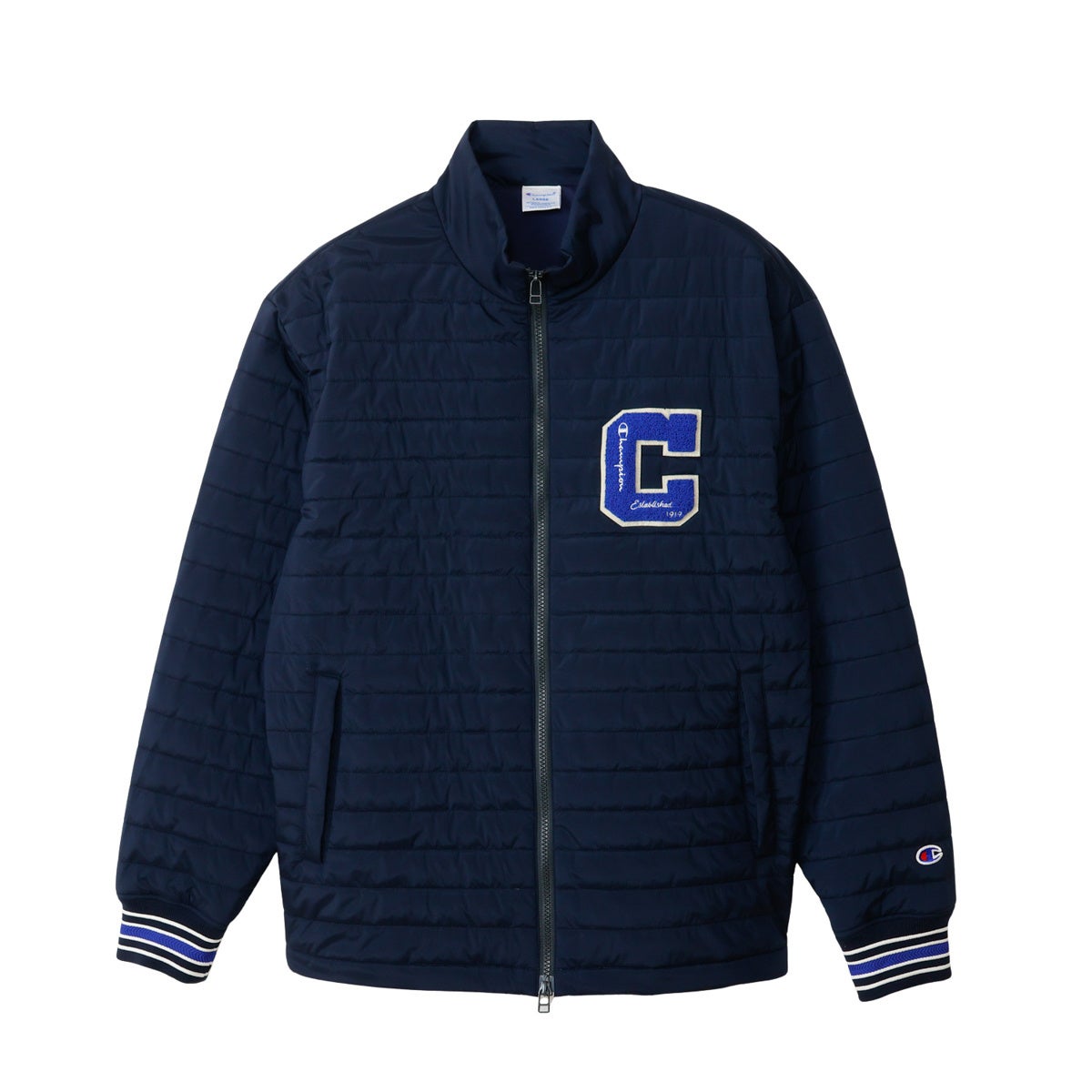 光沢感とストレッチ性を両立したオリジナルタフタ素材を使用した、軽量でストレッチ性、保温性に優れた中綿入りのジップジャケットです。表面には撥水加工を行っています。普段、着慣れた感覚で着用できる程よいリラックスフィットで、袖元のデザインアクセントともなっている、しっかり絞ったラインリブ、ファスナー裏面の当て布で防風効果を高めています。使いやすいダブルジップ仕様、下のジップの開閉によって通気性の調節やかがんだ時のたわみの軽減などが可能です。両サイドにポケットを付け、裾に付けたドローコードを絞ることで風の侵入を防ぎ、さらに防寒性を高めています。胸にはカレッジ風のフォントでC、Champion(チャンピオン)、「Established 1919]をサガラ刺繍で入れました。