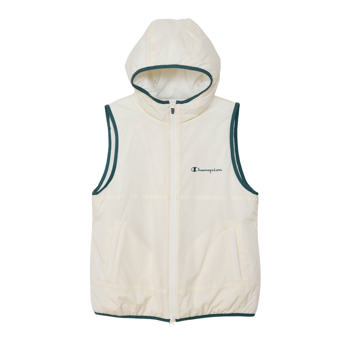 光沢感とストレッチ性を両立したオリジナルタフタ素材を使用した、軽量でストレッチ性、保温性に優れた中綿入りのフード付きジップベストです。表面には撥水加工を行っています。 ステッチの少なめのざっくりしたカジュアル感の高い仕様で、軽快に仕上げています。使いやすいダブルジップ仕様、下のジップの開閉によって通気性の調節やかがんだ時のたわみの軽減などが可能です。両サイドにポケットを付けています。胸にChampion(チャンピオン)ロゴをラバープリントで入れたシンプルなモデルです。