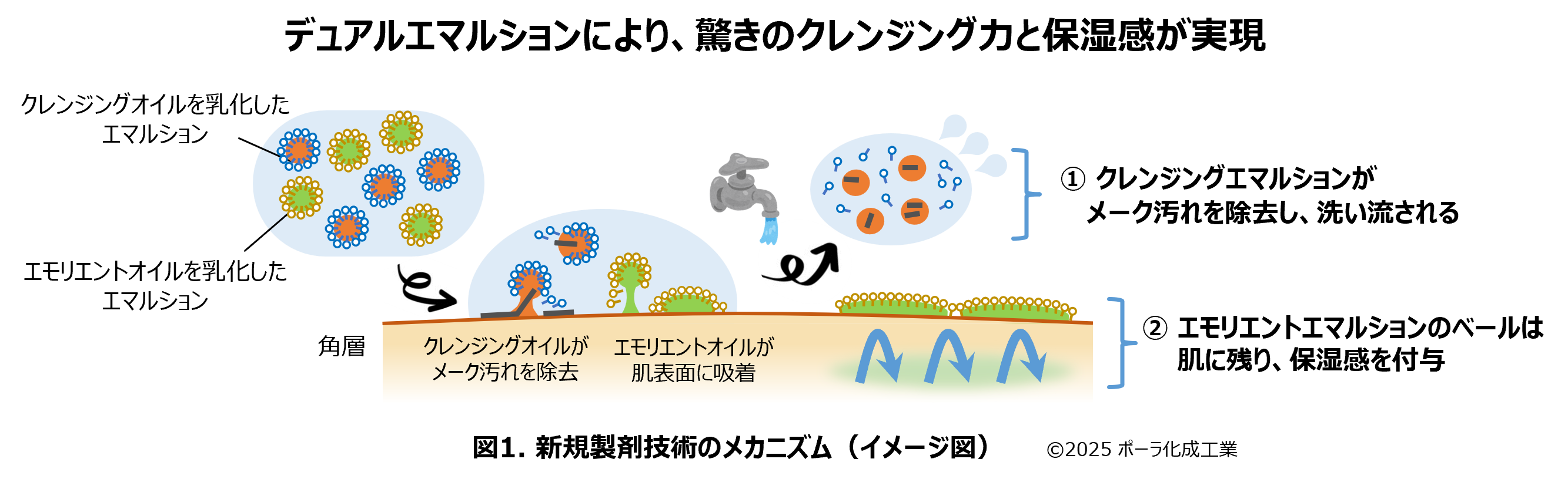 クリームクレンジングには一般的に、メーク汚れの溶かし込みに優れたクレンジング用オイルの他に、肌の保護に優れた保湿用エモリエントオイルが使われています。それらの機能を引き出すには、クレンジング用オイルはすっきりと洗い流し、エモリエントオイルは肌に残すことが重要な鍵となります。しかしこれまでの技術ではエマルション中で両オイルが均一に混ざり合っているため、オイルの洗い流しやすさを改善するとエモリエントオイルも流されてしまい、逆にエモリエントオイルを肌に残そうとするとメーク汚れを含んだクレンジング用オイルも一緒に残ってしまうというトレードオフの関係にありました。そこで着目したのが、異なるオイルからなる2つ以上のエマルション滴を1つのクリーム中に共存させる「複合エマルション(※1)」技術です。油分を多く含むクリームクレンジングでは複合エマルションの実現が難しいとされていましたが(補足資料1)、乳化剤を適切に使い分けることで、クレンジング用オイルのエマルションと、エモリエントオイルのエマルションを別々に、かつ安定的に共存・維持させた「デュアルエマルション」とすることに成功しました(補足資料2)。これにより、クレンジング用オイルを効率的に洗い流し、エモリエントオイルは肌に残りやすい設計が可能となりました(図1)。