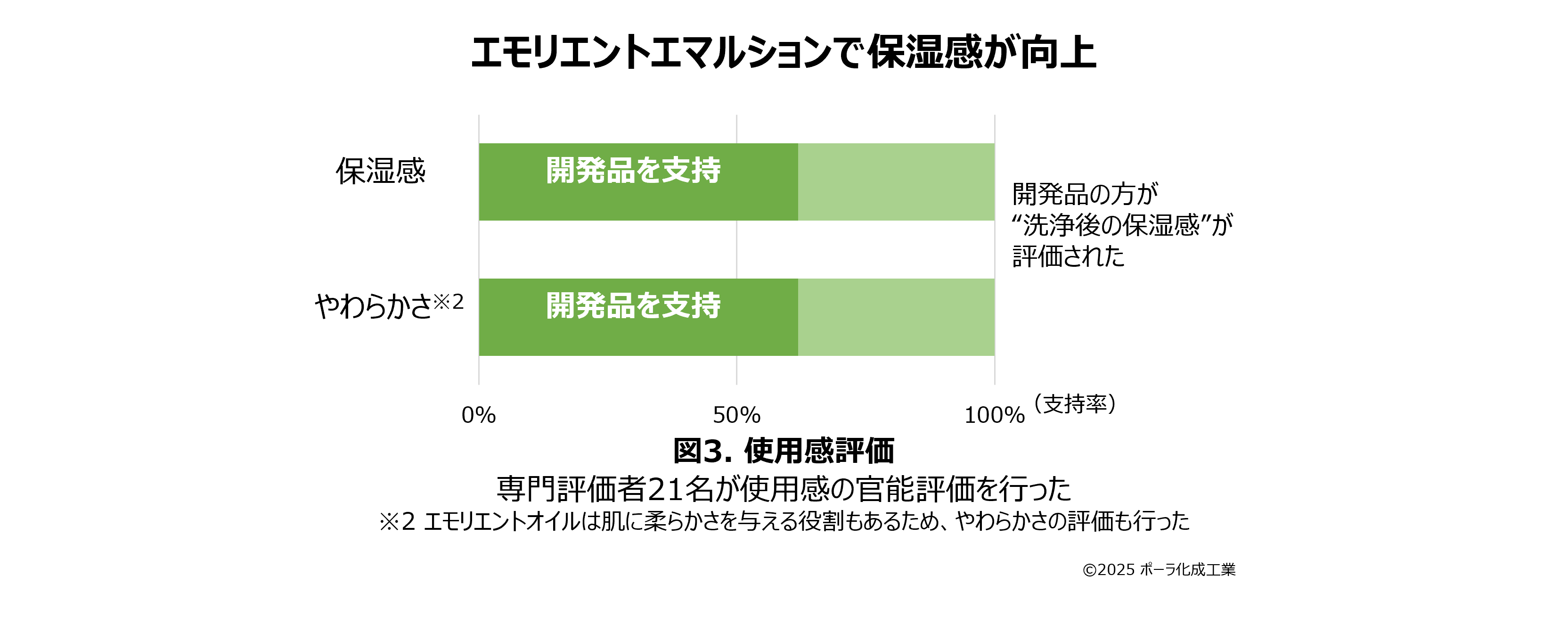モデル実験において、開発品のクレンジング力は自社従来品と比べて明確に向上していることが確認されました(図2)。また保湿感も、専門評価者による使用感評価において高評価を獲得しました(図3)。このことから、メーク汚れをすっきりと除去しつつもエモリエントエマルションのベールを残すことに成功していると考えられます。
