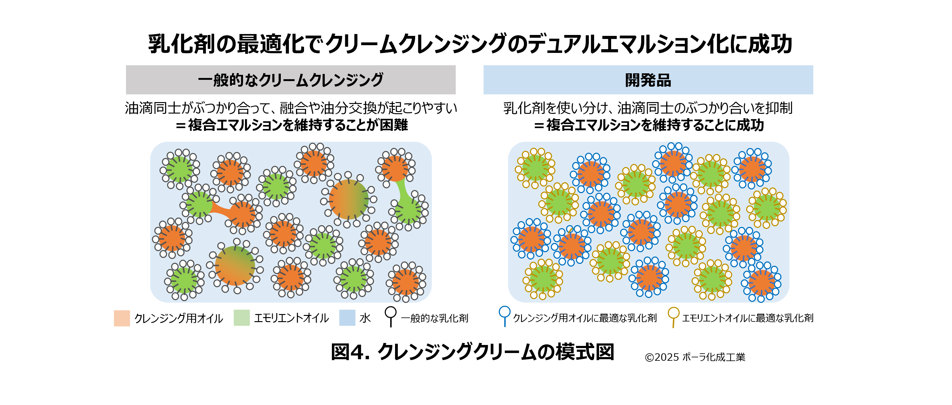 一方、今回開発したクリームクレンジングでは、水と油、そして乳化剤の配合バランスを最適化し、エマルションが均質化しにくい状態を実現しました(図4右)。