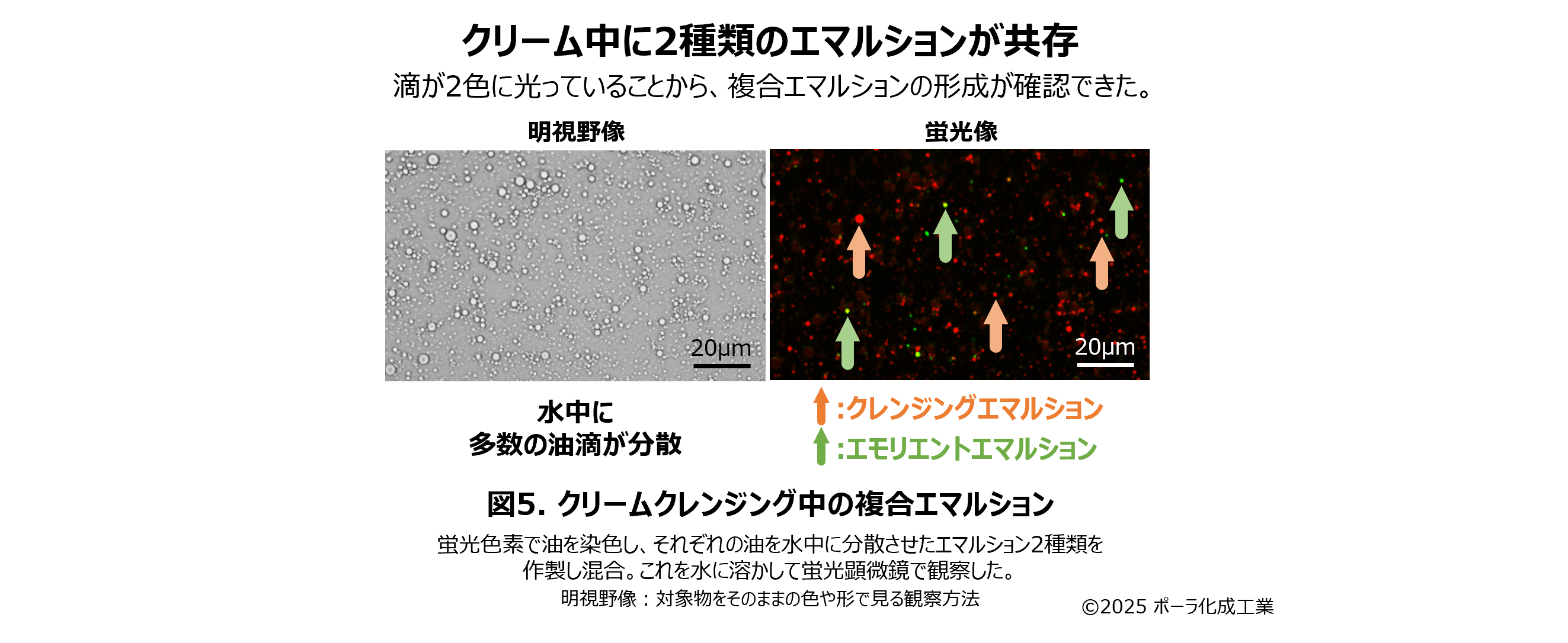 クリーム中に2種類のエマルションが別々に存在しているか調べるため、クレンジング用オイルのエマルションを赤の蛍光色素で、エモリエントオイルのエマルションを緑の蛍光色素で染色し、1つのクリームに配合しエマルション滴を観察しました。