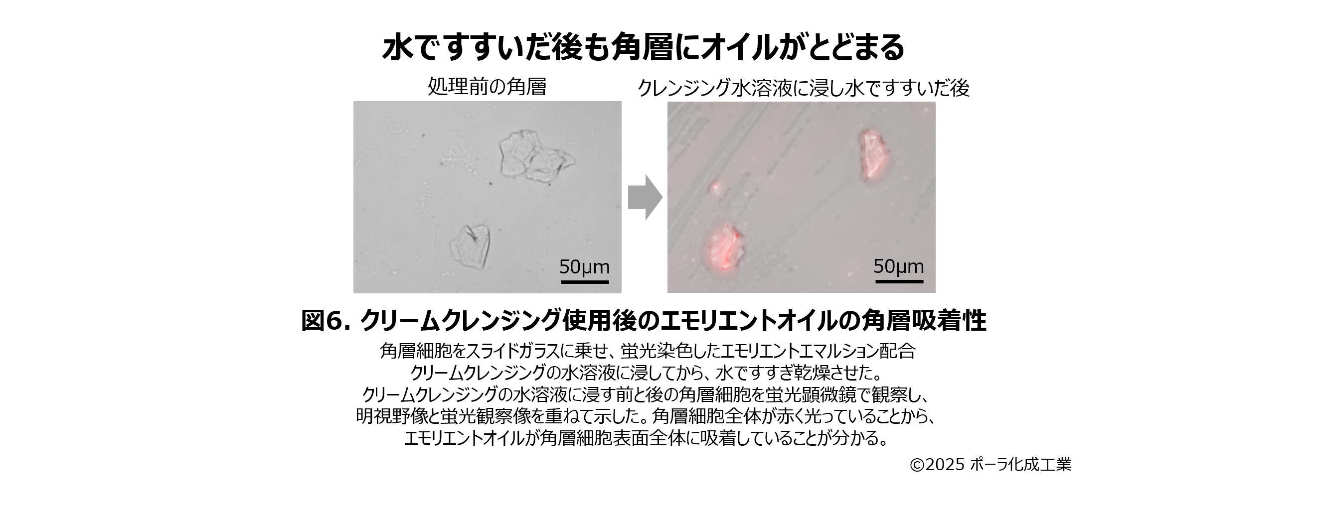 また、洗浄後にエモリエントオイルが角層に吸着するかを検証しました。まず、赤の蛍光色素で染色したエモリエントオイルのエマルションをクリームクレンジングに配合し、すすぎ中の条件を再現するために水と混ぜました。角層細胞をこれに浸して水ですすいでから観察すると、角層細胞全体が赤く光って見えたことから(図6)、エモリエントオイルが角層細胞の表面全体に均一に吸着しているものと考えられました。