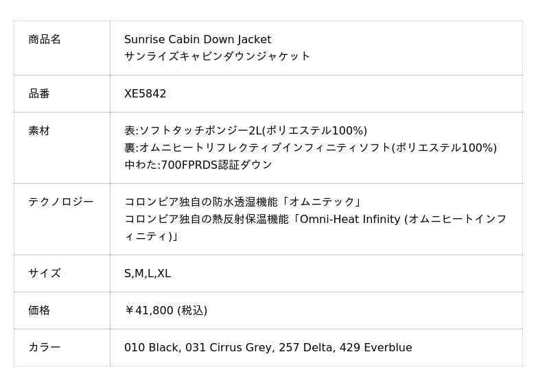 同テクノロジーを採用した『Sunrise Cabin Down Jacket』(サンライズキャビンダウンジャケット) 』は、さらに防水透湿機能の「Omni-Tech (オムニテック)」を搭載し、雪や雨にも強く、濡れによるダウンの保温低下を防ぎます。また高品質な700FPダウンを封入しつつ、軽量性と保温性を両立し、縫い目のないフラットな表面構造で、コールドスポットを軽減しています。