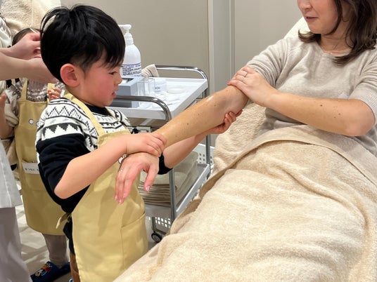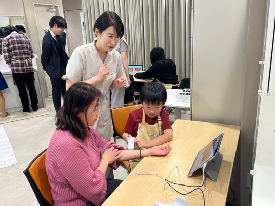 自分の顔やママの腕の画像を興味深く観察。マセを使ったハンドケア体験では、楽しそうな子どもたちと、子どもにお手入れしてもらって嬉しそうなママの顔が印象的でした。
