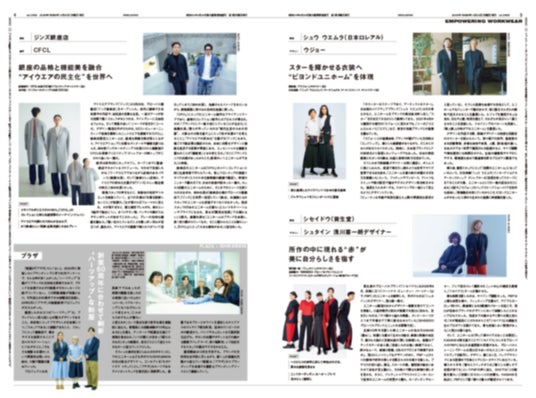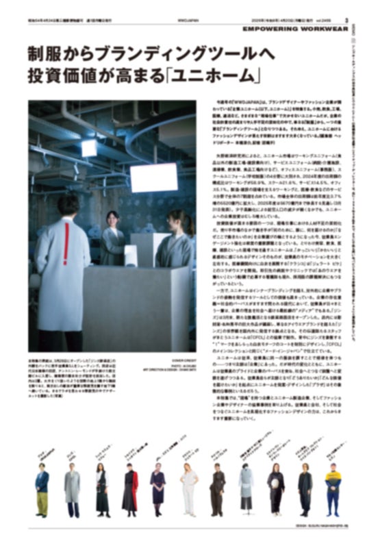 今号の表紙に登場したのは、3月28日にオープンした「ジンズ(JINS)銀座店」のスタッフたち。CFCLの高橋悠介社長兼クリエイティブ・ディレクターとジンズホールディングスの田中亮社長COOは「アイウエアの民主化」と「銀座の品格」の両立を追求し、白衣モチーフのコートを制作。帝人フロンティアのリサイクルポリエステル糸を新潟のニッターで編み立てた”メード・イン・ジャパン”の一着について、完成までのプロセスと背景にある思いを両者に聞きました。そのほかにも資生堂グローバルブランド「シセイドウ(SHISEIDO)」×「シュタイン(SSSTEIN)」浅川喜一朗デザイナー、「シュウ ウエムラ(SHU UEMURA)」×「ウジョー(UJOH)」、「ルナソル(LUNASOL)」×「ハルノブムラタ(HARUNOBUMURATA)」といったビューティブランドがファッションデザイナーとの協業で作る店頭スタッフの装いや、「エズミ(EZUMI)」の江角泰俊デザイナーが手掛け6年にわたり現場を支えるJALのユニホーム、川崎市 藤子・F・不二雄ミュージアムとユナイテッドアローズ(UNITED ARROWS)のコラボなど、ビューティ、飲食、航空、文化施設、引っ越し、ホテルまで業種を横断してユニホームの製作事例を取材しました。