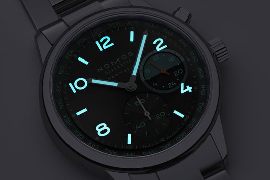 特徴:ワールドタイム、24時間および昼夜の表示のホームタイム、青焼きヒゲゼンマイを用いたノモススイング システム、両側ネジ固定ノモス・バランスブリッジ、ストップセコンド機構、地球の飾り付き両方向巻き上げローター、グラスヒュッテ¾プレート、DUWレギュレトリーシステム、6姿勢での調整、ルビー37石、青焼きネジ、ロジウムメッキを施したムーブメント表面にグラスヒュッテ・ストライプ仕上げおよびノモス・ペルラージュ仕上げ