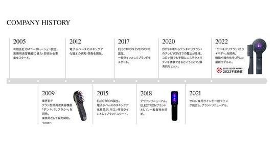 『 ELECTRON(エレクトロン)』ブランドで、ブラシ型の低周波モバイル美容機器『デンキバリブラシ(R)』、活性電子水(TM)(整肌成分)をベースに、独自の加工を施した新感覚のスキンケア製品を展開。