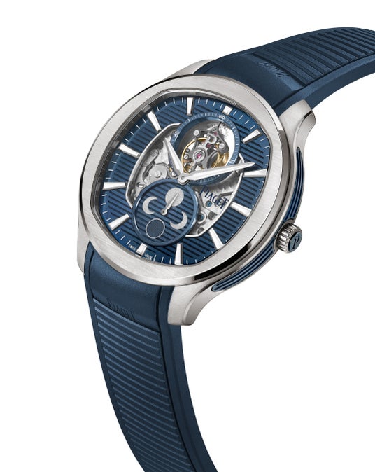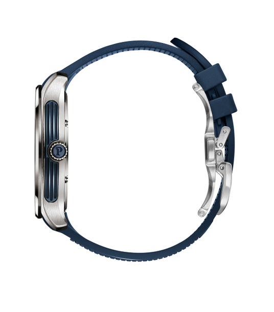 グレーとブルーのチタンで装われたピアジェ ポロは、現代的な複雑機構の探求を続けています。そのデザインはピアジェ スタイルの特徴である、最も優美な薄さ、最も大胆な素材、最も生来のエレガンスから逸脱することはありません。