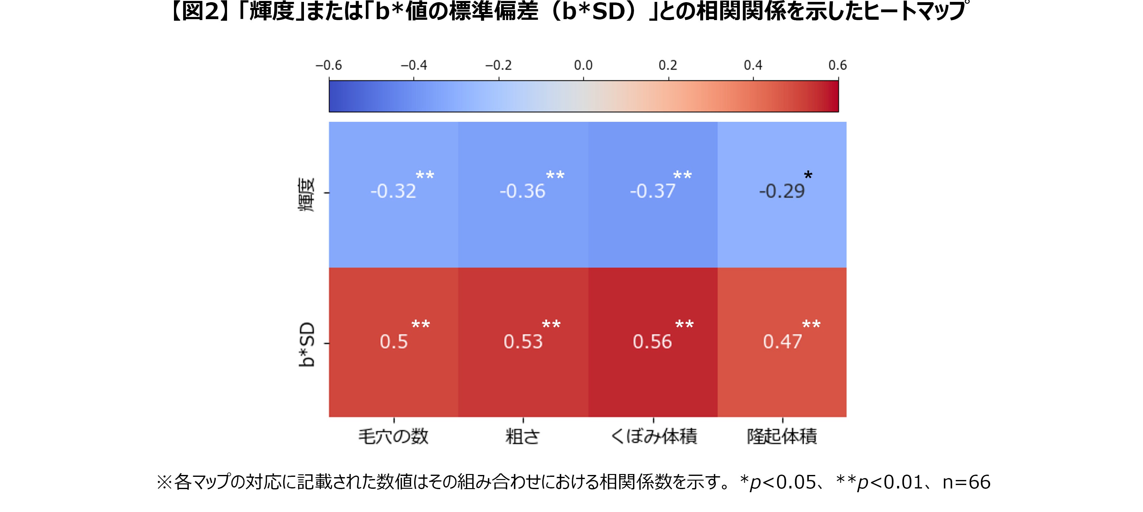 それぞれの指標と4種のキメ評価値との相関を、スピアマンの順位相関係数を用いて解析した結果、すべての組み合わせにおいて有意な相関が認められました。なかでも、肌の色ムラを示す「b*値の標準偏差(b*SD)」とキメ評価値との間に、特に高い正の相関が確認されました【図2】。