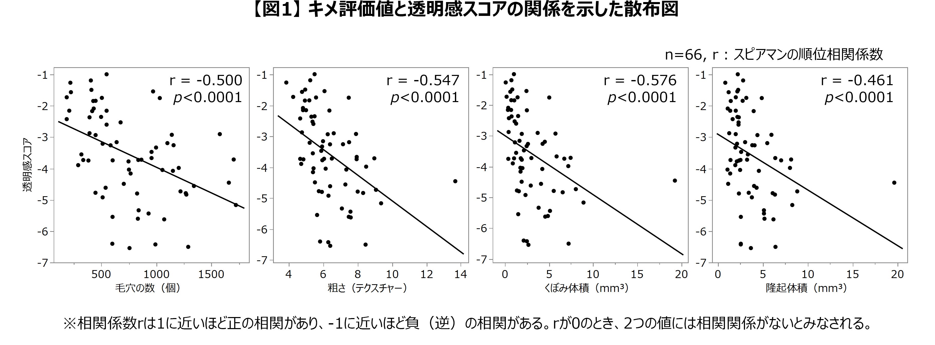 (1)「透明感スコア」と「アンテラ3D」から得られたキメ評価値(*3)との相関解析