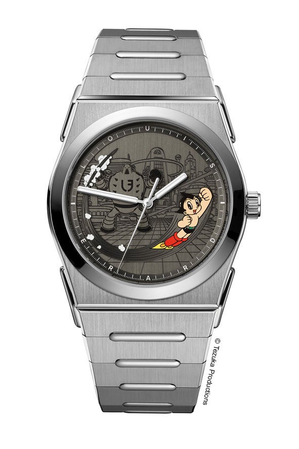 1952年から今日まで、マンガの父・手塚治虫によって生み出された『鉄腕アトム』は、世界的なポップカルチャーのレジェンドです。この小さなロボットは天才科学者が子供を失った悲しみのなか、その子供の代わりとして作られました。アトムは人間の心をもって世の中の不正と戦いました。人間よりも人間らしいロボットというパラドックス。『鉄腕アトム』は、世界中で希望、人間性、そして共存の象徴となっています。この特別版のために、ルイ・エラールは手塚プロダクションと提携し、名作『鉄腕アトム』シリーズのオリジナルイラストの使用権を取得しました。緻密な編集、レイヤー、彫刻が施されたアトムは、単に文字盤にプリントされているわけではありません。空を飛ぶ『鉄腕アトム』のジェットとダイナミックな動きの軌跡が立体的に表現されており生き生きとした印象を与えます。その背後には、シリーズでお馴染みの「地上最大のロボットの1体」、ブランドが、ブラックで繊細に描かれています。二人の間には「未来都市」が彫刻により描かれています。またケースバックには、『鉄腕アトム』の伝説と彼が戦った未来へのオマージュとしてカスタムエングレービングが施されています。