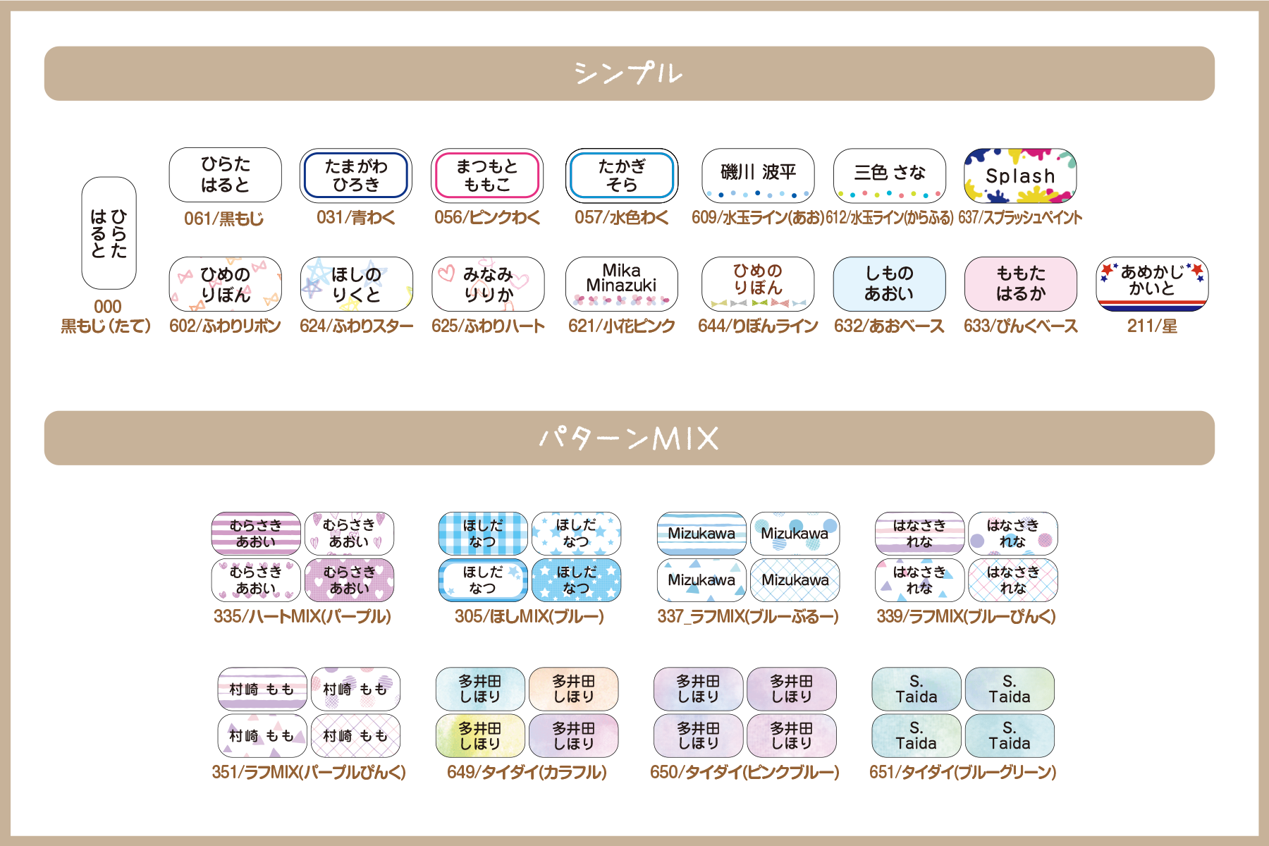 入園準備から小学校高学年まで使える、シンプル~イラスト入りの70デザインをご用意。特に小学生に人気のデザインから厳選したデザインをセレクトしました。1種類ですが縦文字もご用意しています。