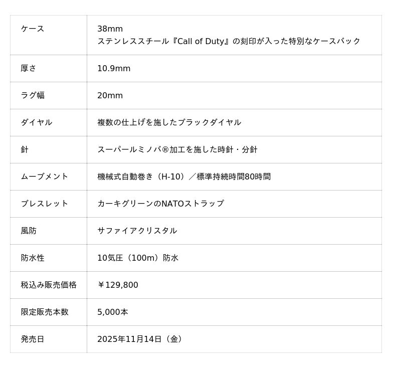 ハミルトンは、世界的人気を誇るゲームシリーズ『Call of Duty(R)』の最新作『Call of Duty(R): Black Ops 7』とのコラボレーションモデルを「カーキ フィールド オート コール オブ デューティ」を、ゲームのリリースと同日11月14日(金)に発売します。精密なスイス製ウォッチメイキングと、没入型ストーリーテリングがクロスオーバーするこのプロジェクトは、ハミルトンにとって3度目となるゲームとのパートナーシップです。