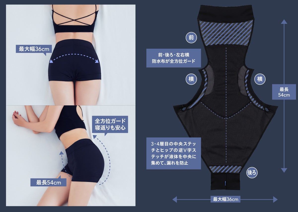吸収体は全長約54cm、最大幅36cm。座っている状態の前傾姿勢やうつ伏せ寝の際に起こりがちな前モレ、後ろモレ、伝いモレまで全方位でガードします。