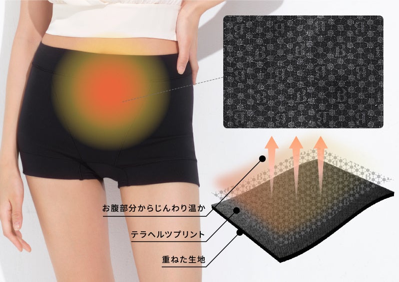 1秒間に1兆回振動する電磁波「テラヘルツ波」を放出する鉱石をパウダー化し、お腹に触れる生地へプリント。独自技術によって、未加工の生地との放射率の差は、従来品に比べて2倍に高まりました。