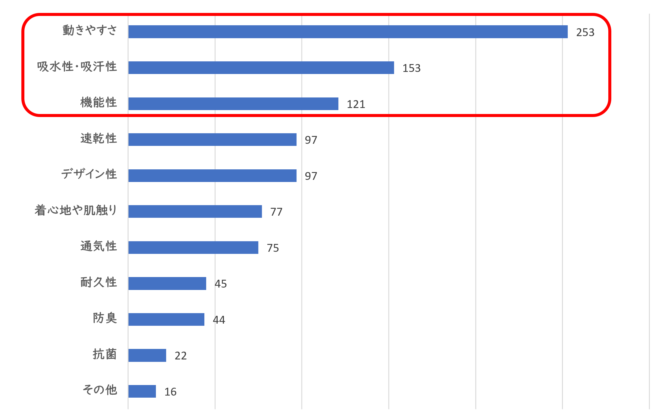 ・スポーツウェアに求めることは、1位「動きやすさ」、2位「吸水性・吸汗性」、3位「機能性」