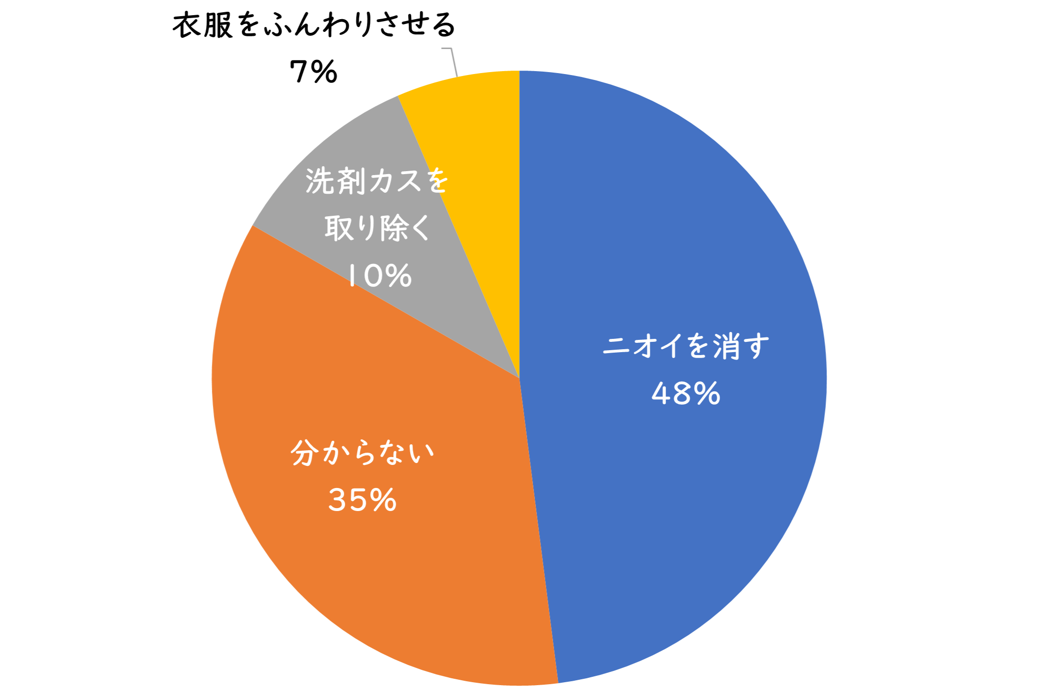 洗濯におけるクエン酸の効果について質問したところ、「ニオイを消す」という回答が48%と最も多く、「洗剤カスを取り除く」、「衣服をふんわりさせる」効果についてはそれぞれ10%、7%とあまり認知されていないことが明らかになりました。石けん成分の洗浄剤を使った洗濯では、石けんカスが衣服に残ることがあります。こうした石けんカスは、クエン酸やお酢を使うことで取り除けます。具体的には、クエン酸小さじ1杯を水200mLに溶かすか、食酢大さじ1杯半を洗濯機の柔軟剤投入口に入れてください。