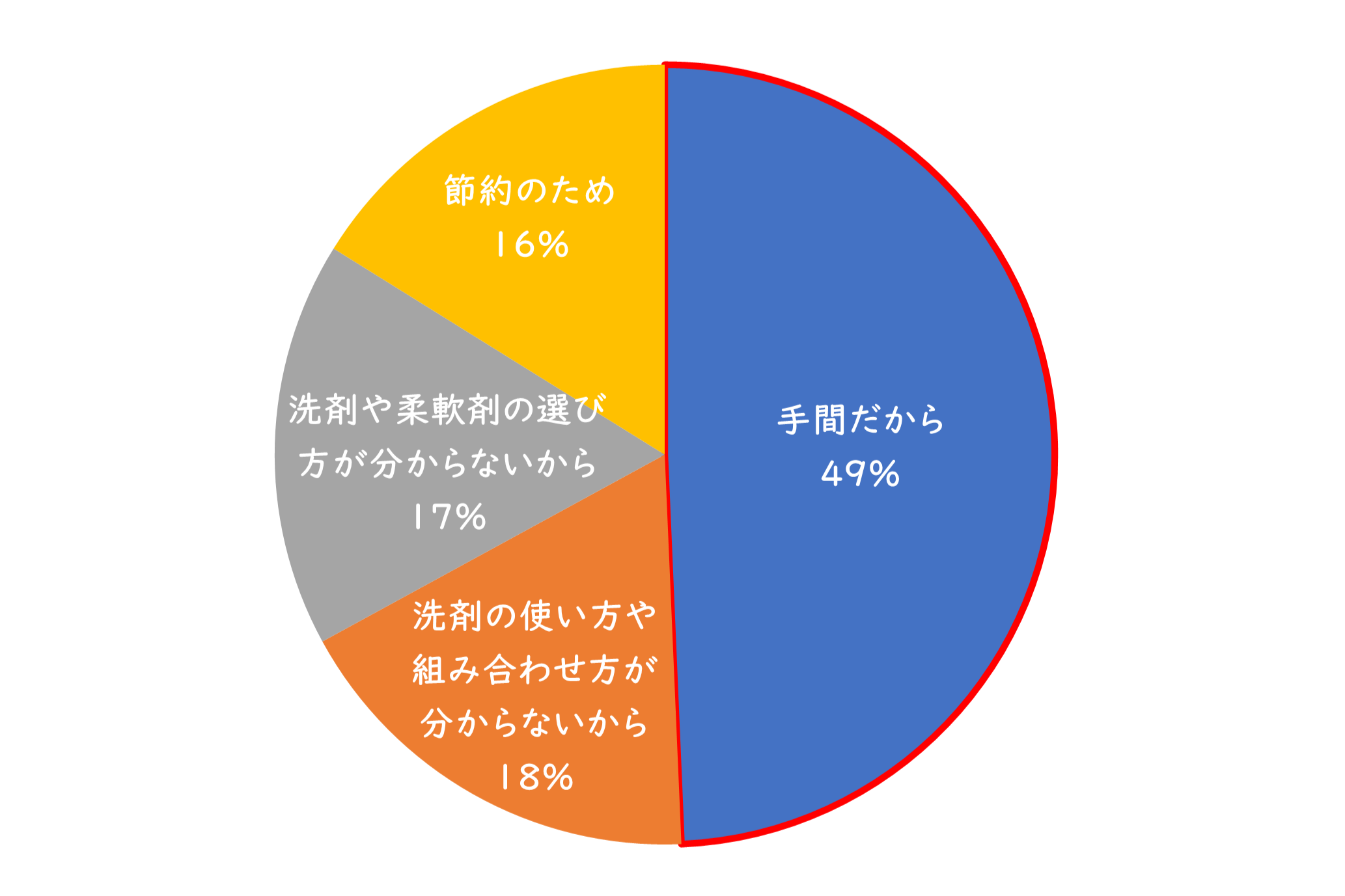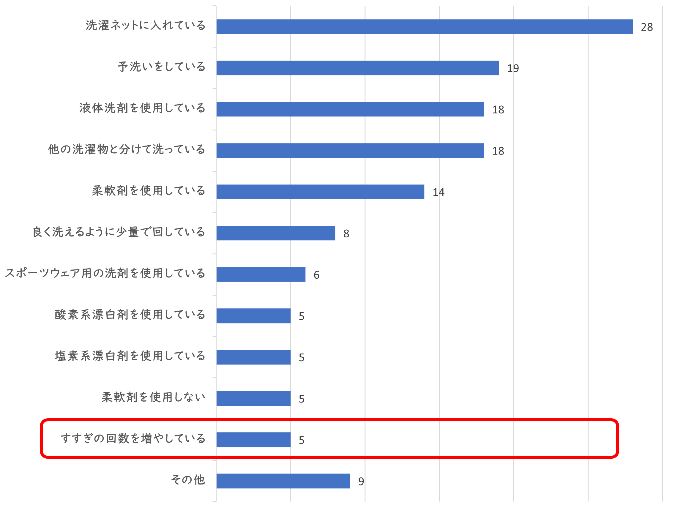 ・スポーツウェアの洗濯方法について、87%の人が「普段の洗濯と変えていない」と回答。最も多い理由は「手間だから」