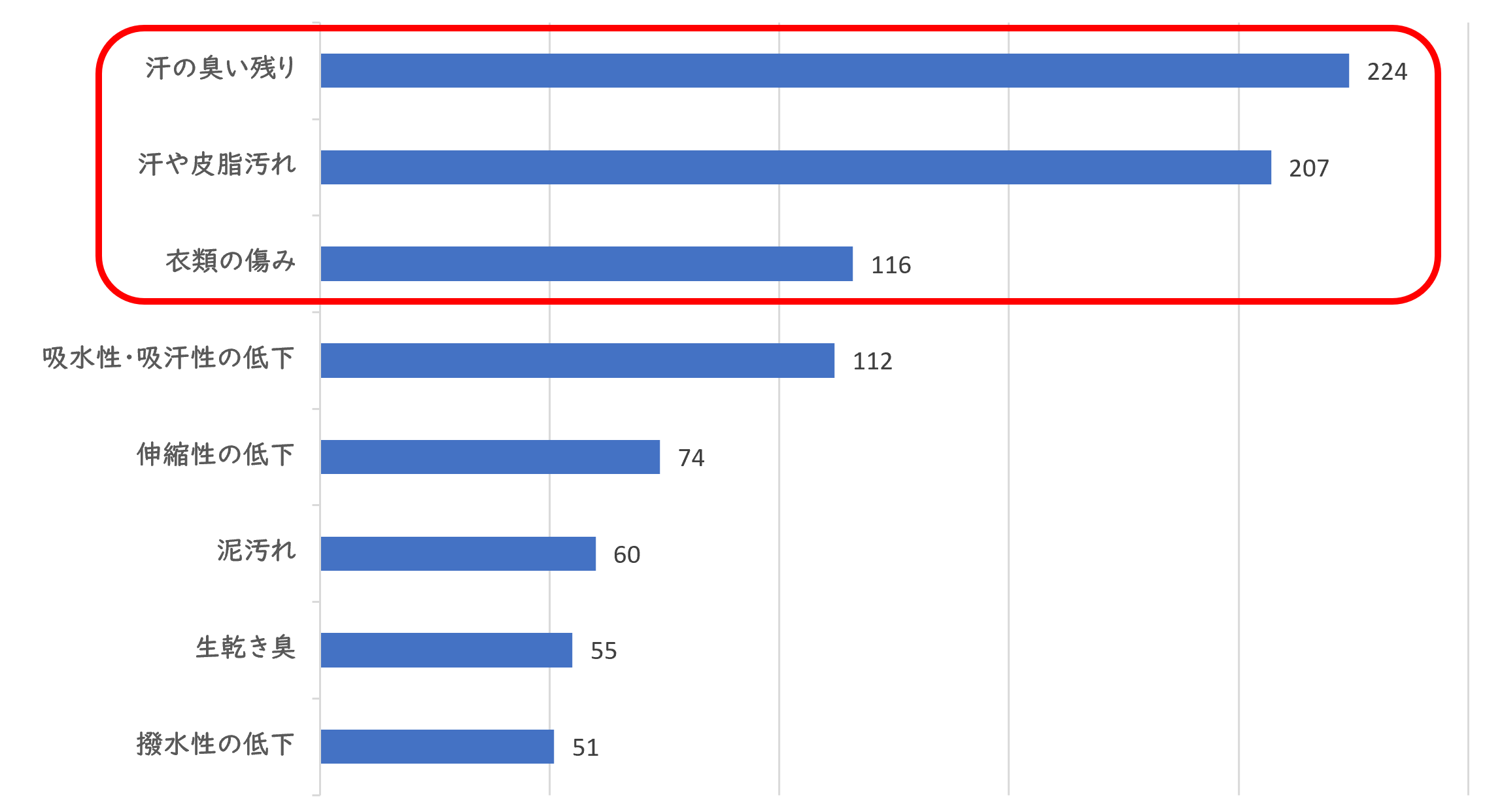 ・スポーツウェアの洗濯で気になることは、1位「汗の臭い残り」、2位「汗・皮脂の汚れ」、3位「衣類の傷み」