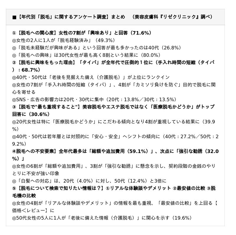 こうした背景を受け、「正しい脱毛で日本中を笑顔に」をビジョンに掲げる美容皮膚科『リゼクリニック』(全国28院展開/医療法人社団風林会 本部:東京都新宿区 総院長:赤塚正洋)では、20~50代の女性1,000名を対象に【女性年代別/医療脱毛に関するアンケート調査】(対象期間:2026年03月27日~28日の2日間・インターネット調査)を実施