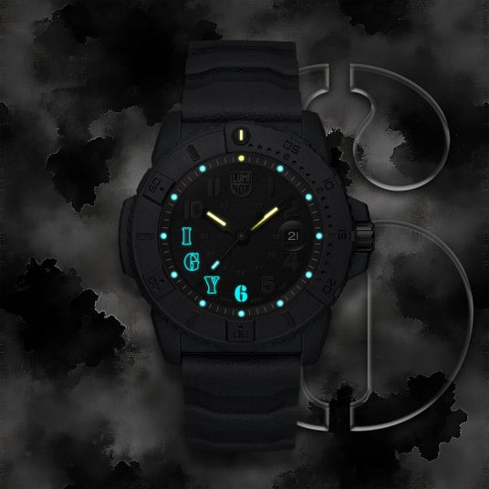 アイスブルーとイエローで垂直に配置された自己発光システム【ルミノックス・ライト・テクノロジー】に加えて、文字盤の6時~9時の間にある「IGY6」の刻印は、スーパールミノバ(R)になっているため、光源により蓄えた光を暗所や低照度環境で鮮やかに発光。これはNavy SEAL Foundationの素晴らしい活動に敬意を表しているだけでなく、高い視認性を誇ります。