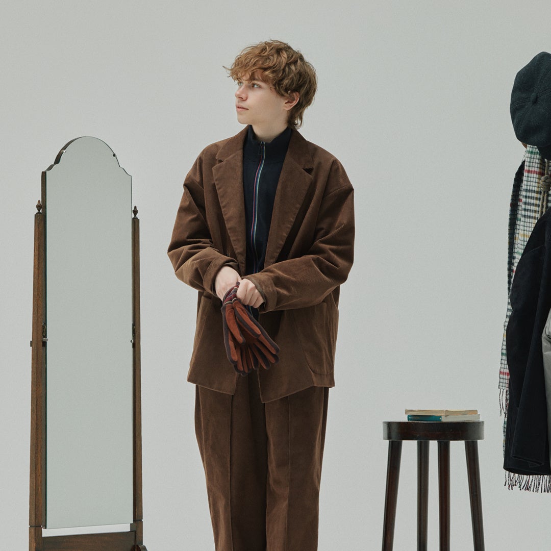 細畝コーデュロイの風合いのいいジャケット&パンツ。オーバーサイズでモダナイズしたセットアップは、シックさとぬくもりを併せ持つ、モダンなジェントルスタイルを実現。